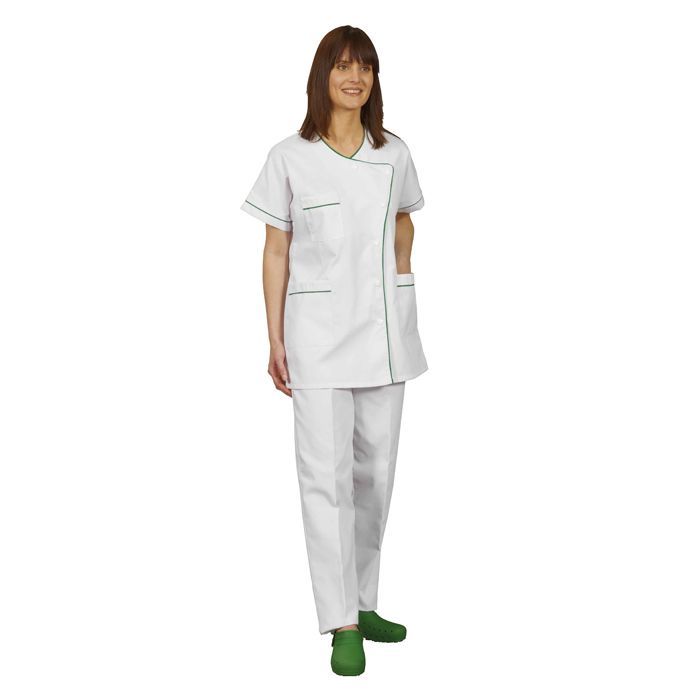Kobieca tunika pikowana Taffa biała z zieloną lamówką Mulliez - Kolor tuniki: biała z zieloną lamówką - Zaokrąglony dekolt z delikatnym wcięciem - Tunika z krótkimi rękawami - 3 naszywane kieszenie