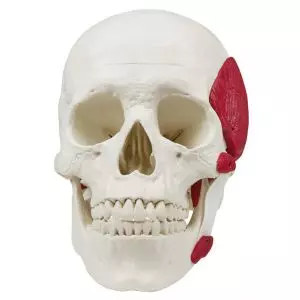 Mięśnie żucia (mięśni żwaczy, mięśnie skroniowe, mięsień skrzydłowo przyśrodkowe i mięśnie boczne) są przedstawione w postaci elastycznych taśm. Wykorzystując ten model można pokazać funkcje mięśni żucia z zamkniętą dolną szczęką, a także zademonstrować otwarcie szczęki oraz przesunięcie żuchwy do przodu i na boki. Sklepienie czaszki może być zdemontowana.